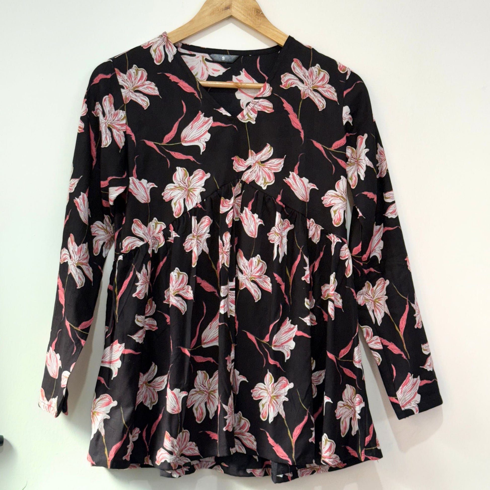 The Night Lily peplum top comes in a classic black base highlighted with soft light-pink lily motifs. Featuring long sleeves and a graceful V-neck, it flows into a flattering peplum that adds shape and elegance. A refined piece that feels feminine, subtle, and timeless.