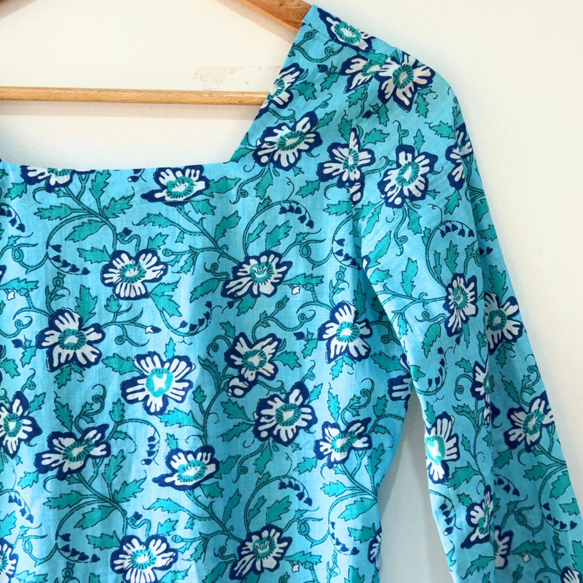 The Shirin corset back kurti features a corset-style back that allows the waist to be adjusted to your body shape. Crafted in a refreshing turquoise-blue shade with delicate floral prints, it is finished with long bell sleeves. A short kurti designed for a flattering fit and effortless style.